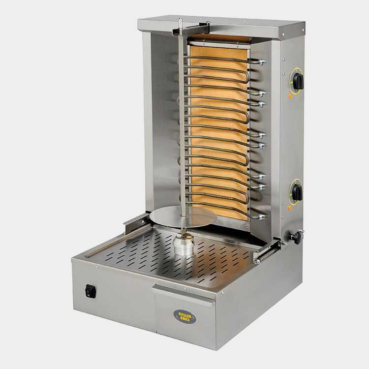 Za enakomerno peko mesa lahko premaknete nastavek in vir toplote regulirate po conah, da prilagodite peko višini in premeru mesa naloženega mesa. Odmik je lahko uravnavati samo z eno roko. Spodnja plošča je v celoti hermetična: motor je zaščiten pred kakršno koli infiltracijo maščobe ali tekočin. Nameščen na kroglične ležaje ne nosi teže mesa, kakor tudi uporabnikovo močno rokovanje: zaščiten je pred kakršnimi koli torzijami. Opremljen je z velikim zbiralnikom soka, ki ga je mogoče odstraniti za čiščenje. Značilnosti: stikalo za vklop / izklop, pilotne luči, kapaciteta pečenja 25 kg.